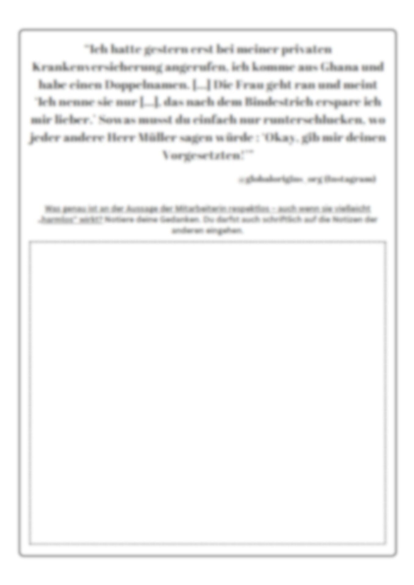 – Die SuS gehen durchs Klassenzimmer und betrachten die unterschiedlichen Zitate, die Erfahrungen zu Alltagsrassismus und Diskriminierung in Deutschland wiedergeben, und hinterlassen ihre Eindrücke dazu in stummen Scheibgeprächen darunter