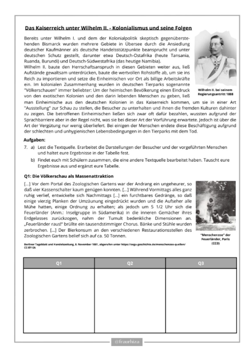 Diese Stunde startet mit einem fiktiven Besuch eines Tierparks des späten 19. und frühen 20. Jahrhunderts. Die SuS stellen dabei fest, dass neben Tieren auch Menschen in den europäischen Zoos ausgestellt wurden – eine grausame Folge des Kolonialismus. Um den Weg Deutschlands in eine aggressive Kolonialpolitik nachvollziehen zu können, erarbeiten sie mithilfe eines Videos zunächst wichtige Merkmale der Außenpolitik unter Bismarck und erfahren anschließend, wie diese sich mit dem Machtantritt Wilhelms II. änderte. Anhand unterschiedlicher Textquellen verstehen sie die Hintergründe der Völkerschau und die Bedeutung für die betroffenen Menschen aus den Kolonien. Zuletzt bewerten sie den Umgang des Leipziger Tierparks mit seiner postkolonialen Vergangenheit am Beispiel des Themenabends “Hakuna Matata”.