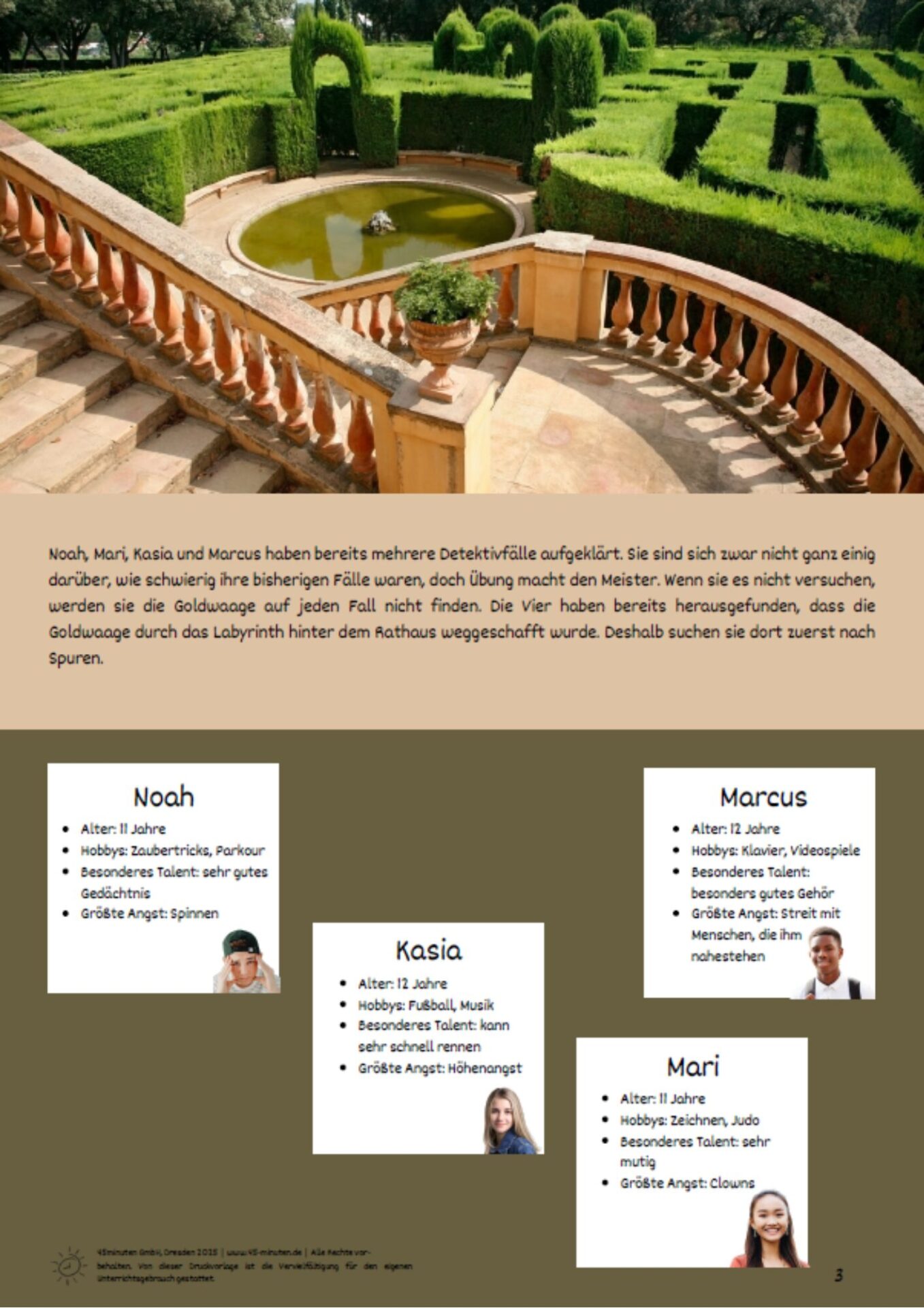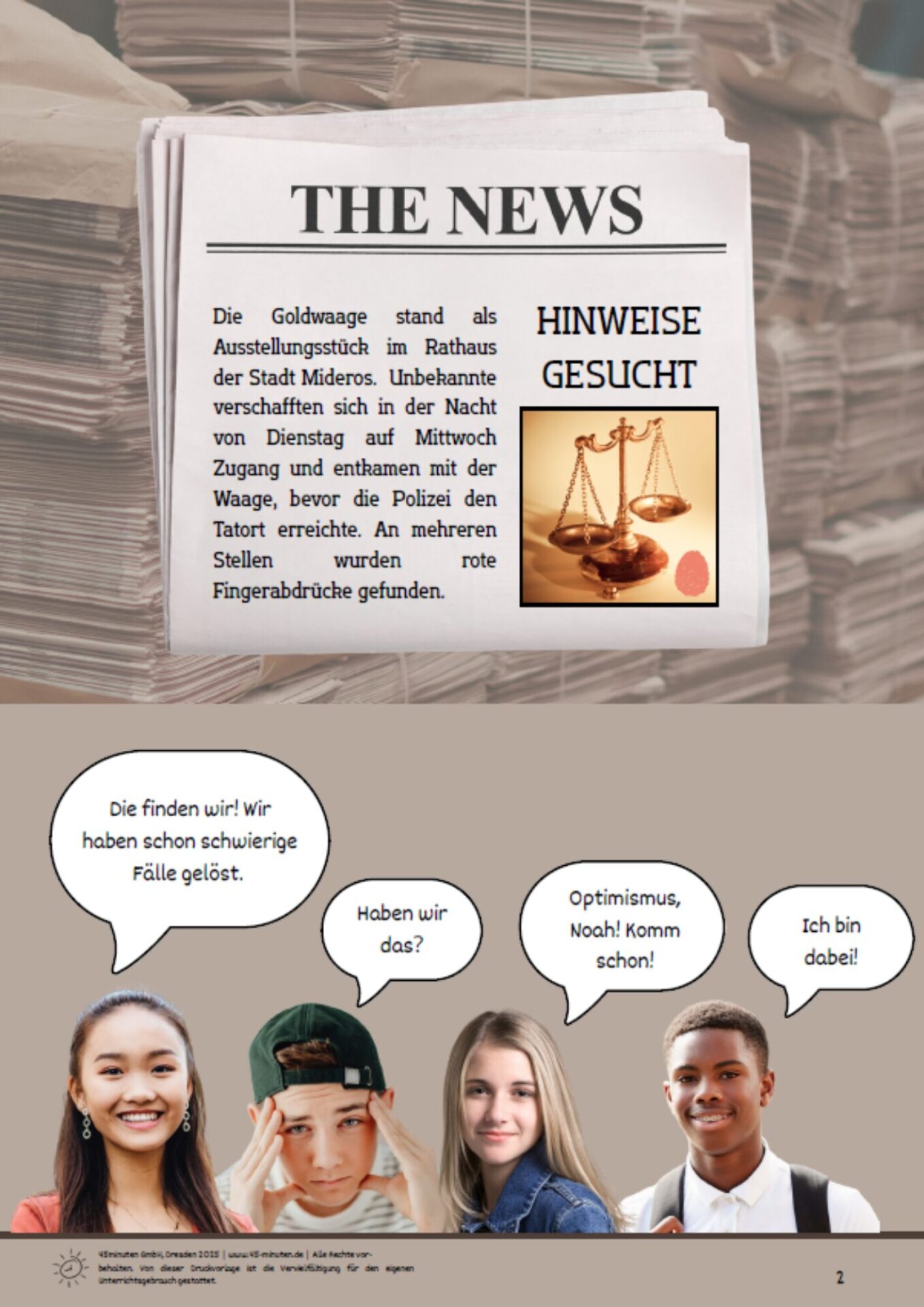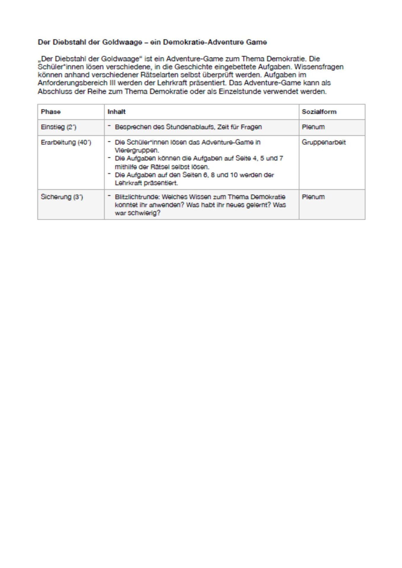 „Der Diebstahl der Goldwaage“ ist ein Adventure-Game zum Thema Demokratie. Die Schüler*innen lösen verschiedene, in die Geschichte eingebettete Aufgaben. Wissensfragen können anhand verschiedener Rätselarten selbst überprüft werden. Aufgaben im Anforderungsbereich III werden der Lehrkraft präsentiert. Das Adventure-Game kann als Abschluss der Reihe zum Thema Demokratie oder als Einzelstunde verwendet werden.