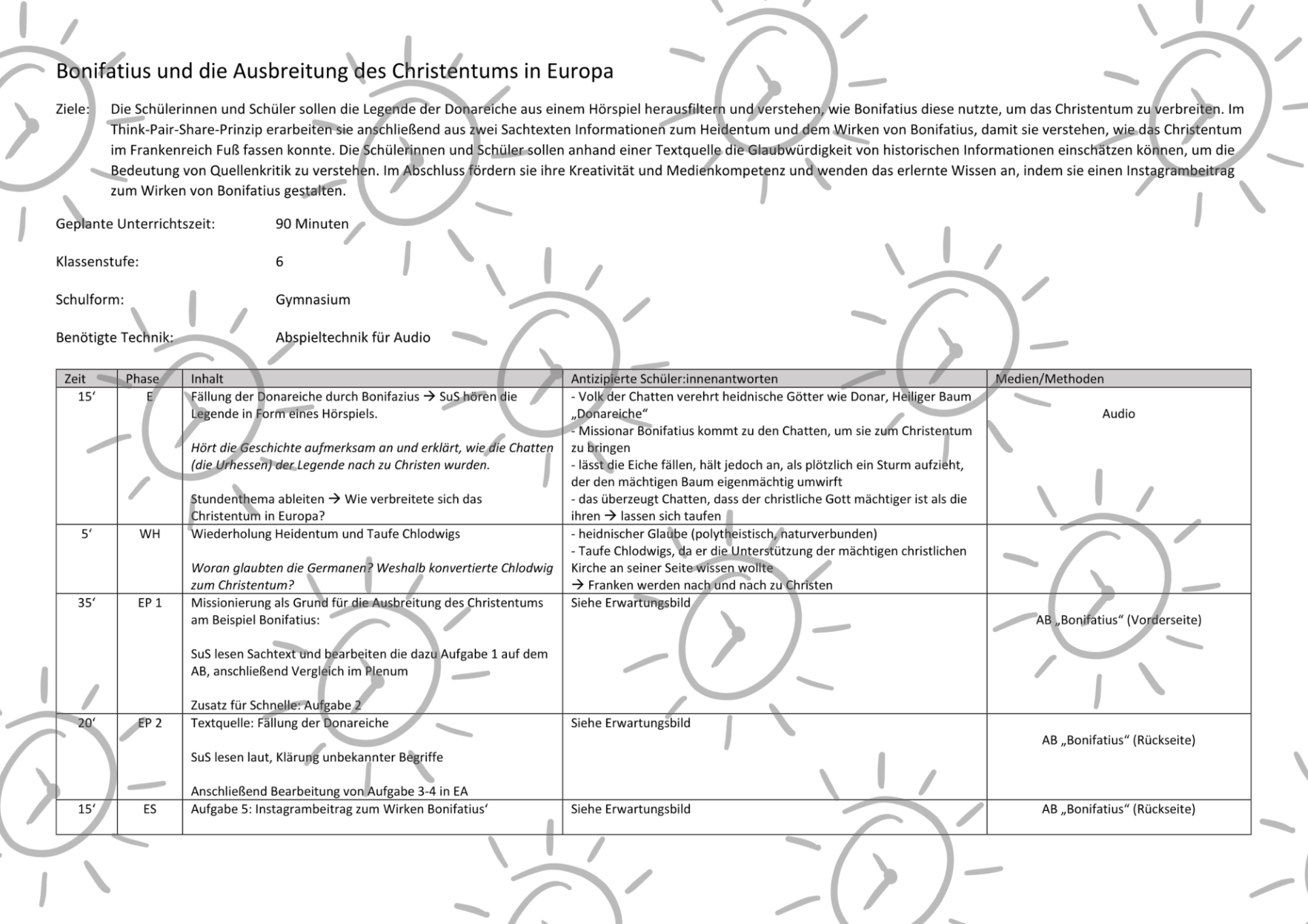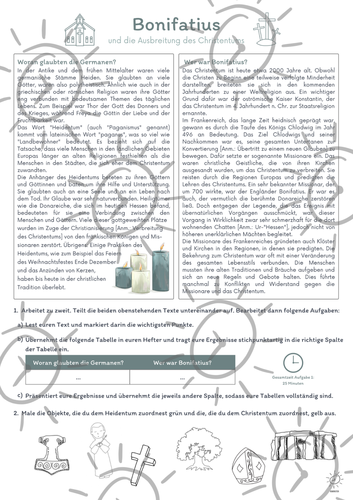 Warum ist Mitteleuropa christlich geprägt? Und woran glaubten unsere Vorfahren? Mithilfe dieses Unterrichtsmaterials lernen die SchülerInnen mehr über die Verbreitung des Christentums im Frankenreich. Dabei berichtet ihnen ein Hörspiel Näheres zur Legende um die Fällung der Donareiche. Im Think-Pair-Share-Prinzip erarbeiten sie Inhalte zum Heidentum und der Missionarstätigkeit und entwickeln ein Verständnis dafür, wie sich das Christentum in weiten Teilen Europas verbreiten konnte. Sie blicken quellenkritisch auf eine Überlieferung zur Fällung der Donareiche und schulen ihr Bewusstsein für die Subjektivität solcher Quellen. Ihr gesammeltes Wissen setzen sie abschließend beim Verfassen eines Instagrambeitrages um Wirken Bonifatius‘ in Szene. Selbstverständlich liegt das Erwartungsbild bei.