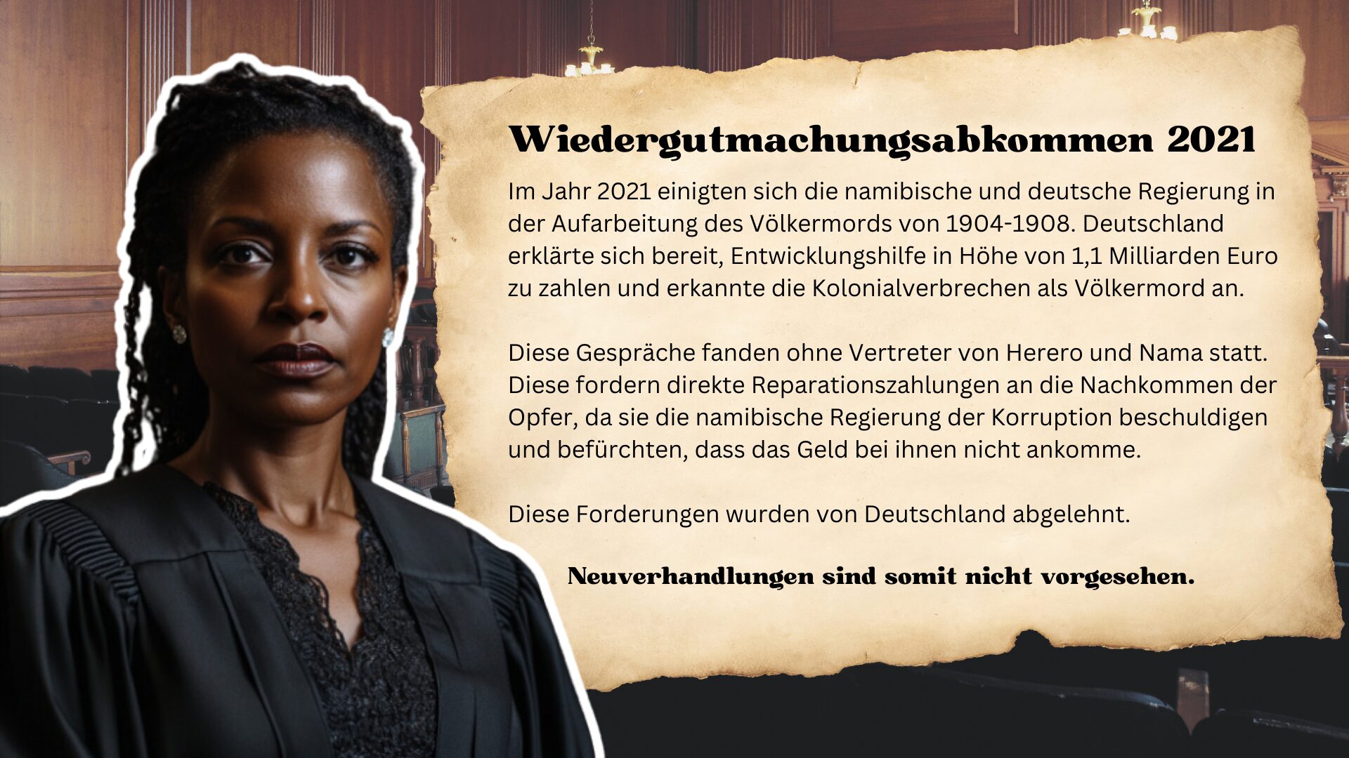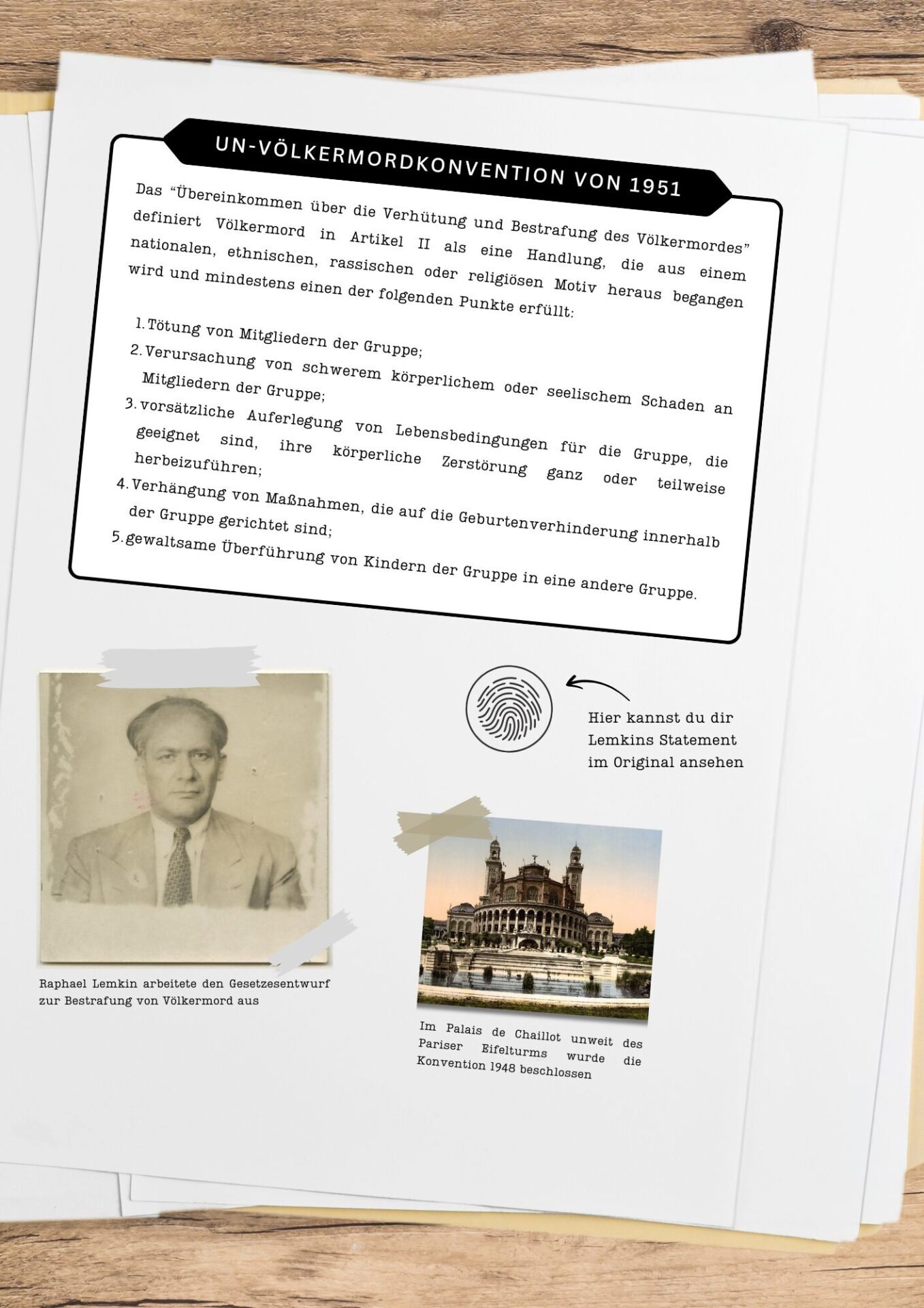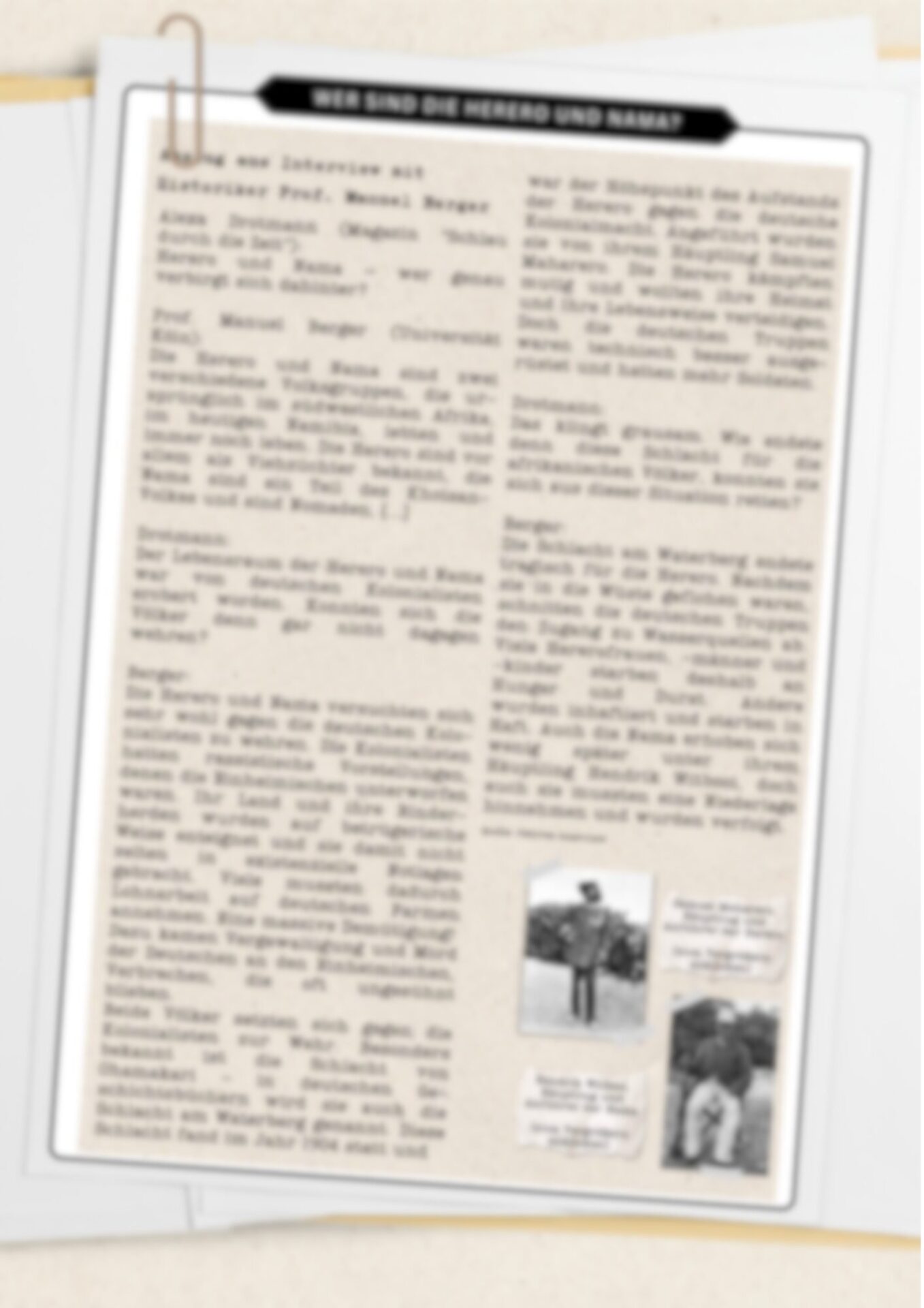 Anmerkung: Das Material selbst gibt die Information über das Wiedergutmachungsabkommen von 2021 bewusst erst am Ende, um die Arbeit der Lernenden nicht zu beeinflussen und sie ihr eigenes Urteil basierend auf der UN-Völkerrechtskonvention treffen zu lassen. Die Lehrkraft sollte an dieser Stelle selbst die Entscheidung treffen, ob sie die Lernenden bewusst für die Dauer der Bearbeitung “im Dunkeln lässt” oder die mittlerweile erfolgte Anerkennung des Genozids von deutscher Seite von Anfang an transparent als Information mit in die Erarbeitung gibt.