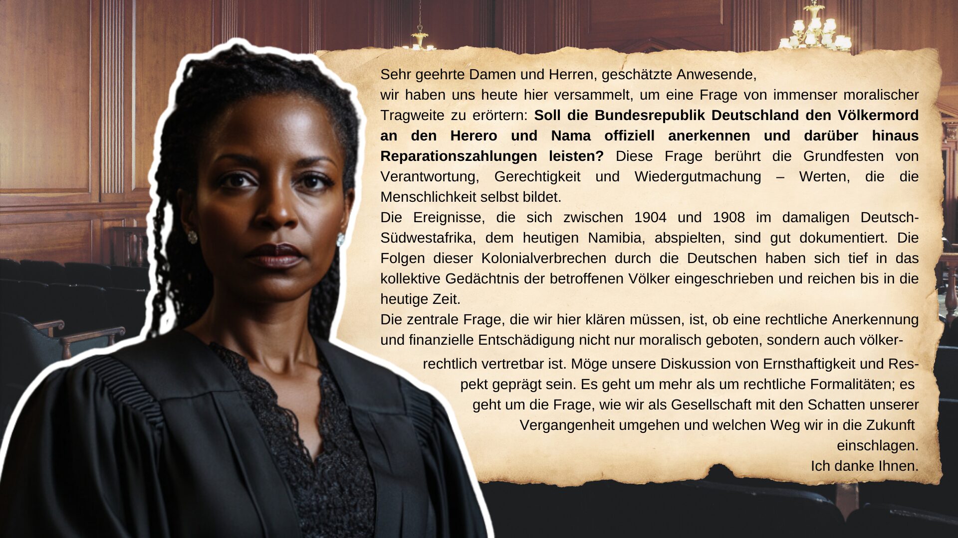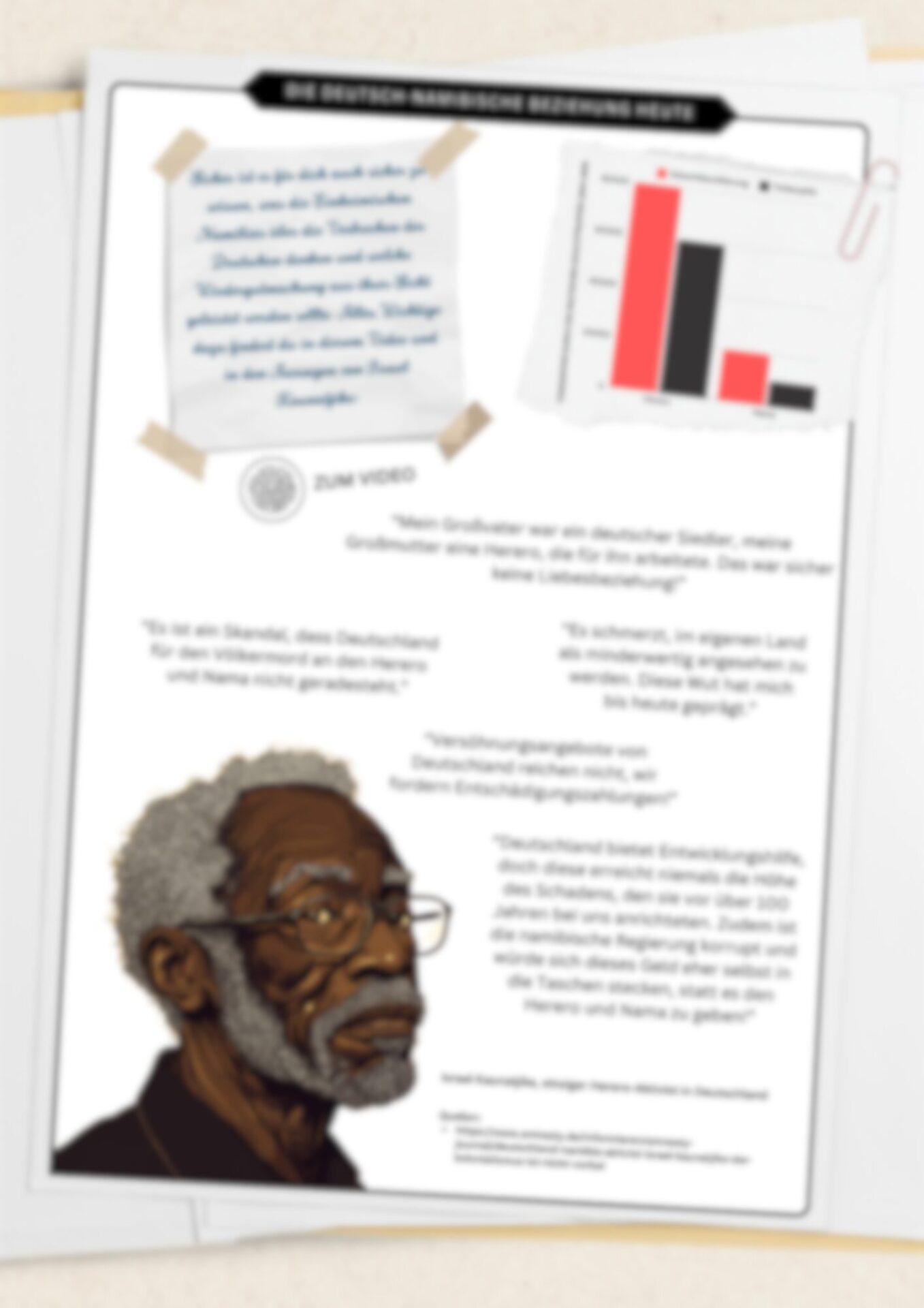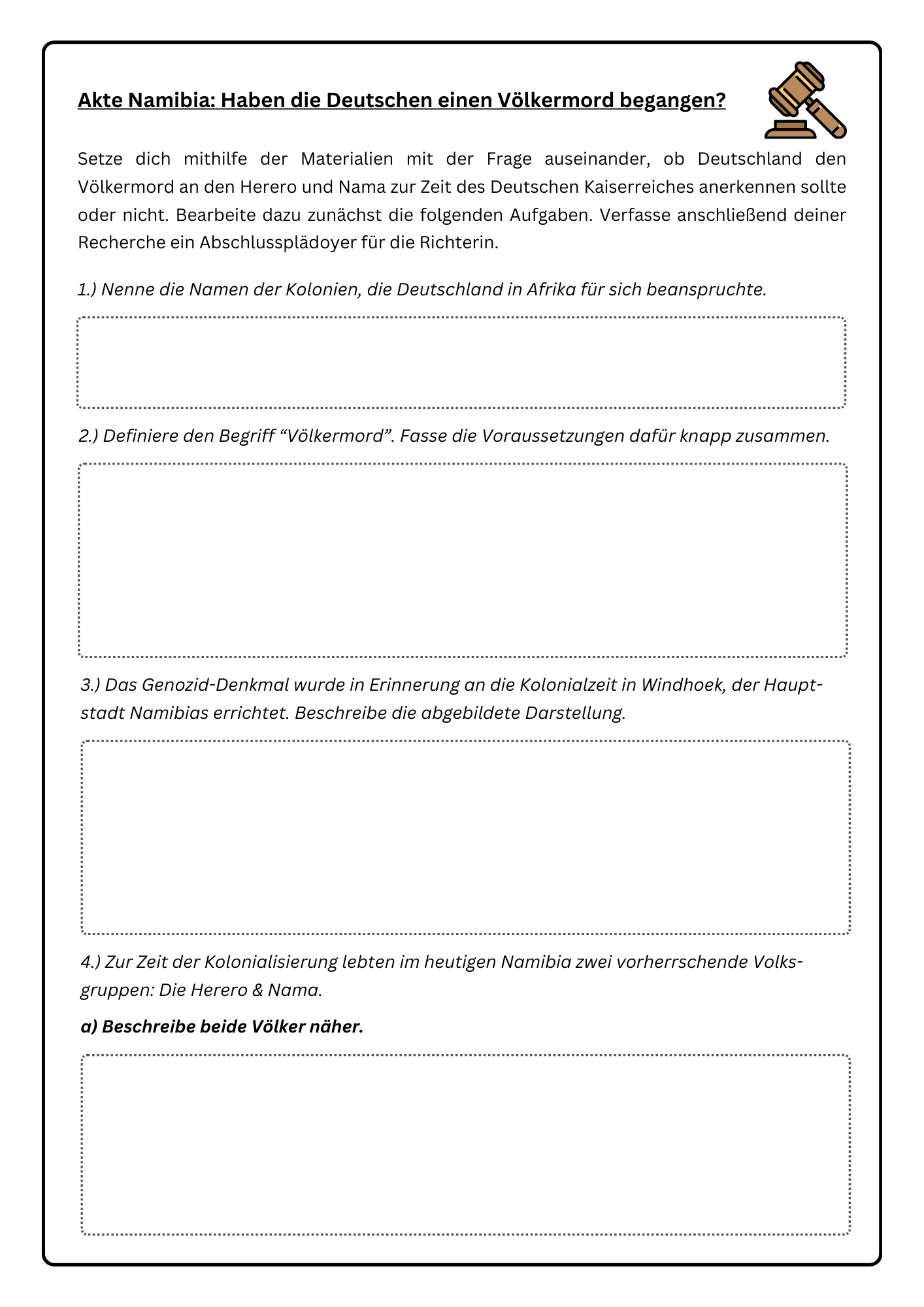 Im Jahr 2021 erkannte Deutschland die Kolonialverbrechen im ehemaligen Deutsch-Südwestafrika nach jahrelangen Streitigkeiten als Genozid an. Doch eine Wiedergutmachung ist in den Augen vieler Herero- und Namanachkommen noch lang nicht erfolgt. Mit diesem Unterrichtsmaterial tauchen die Schüler:innen in die Szenarie einer Gerichtsverhandlung ab, die sich mit den Verbrechen der deutschen Kolonialisten an den Völkern der Herero und Nama beschäftigt. Mithilfe einer Gerichtsakte und darin enthaltenen Interviews, Textquellen und Übersichten gehen sie zunächst selbst der Frage nach, was sich vor über 100 Jahren im heutigen Namibia zutrug und inwiefern die Verbrechen von 1904-1908 als Völkermord bezeichnet werden können. Anschließend formulieren sie ein Abschlussplädoyer aus Sicht der Richterin, in dem sie ihre Untersuchungsergebnisse darlegen. Dadurch eignet sich die Stunde auch gut zur Einführung des Operators “Beurteilen” im Fach Geschichte.