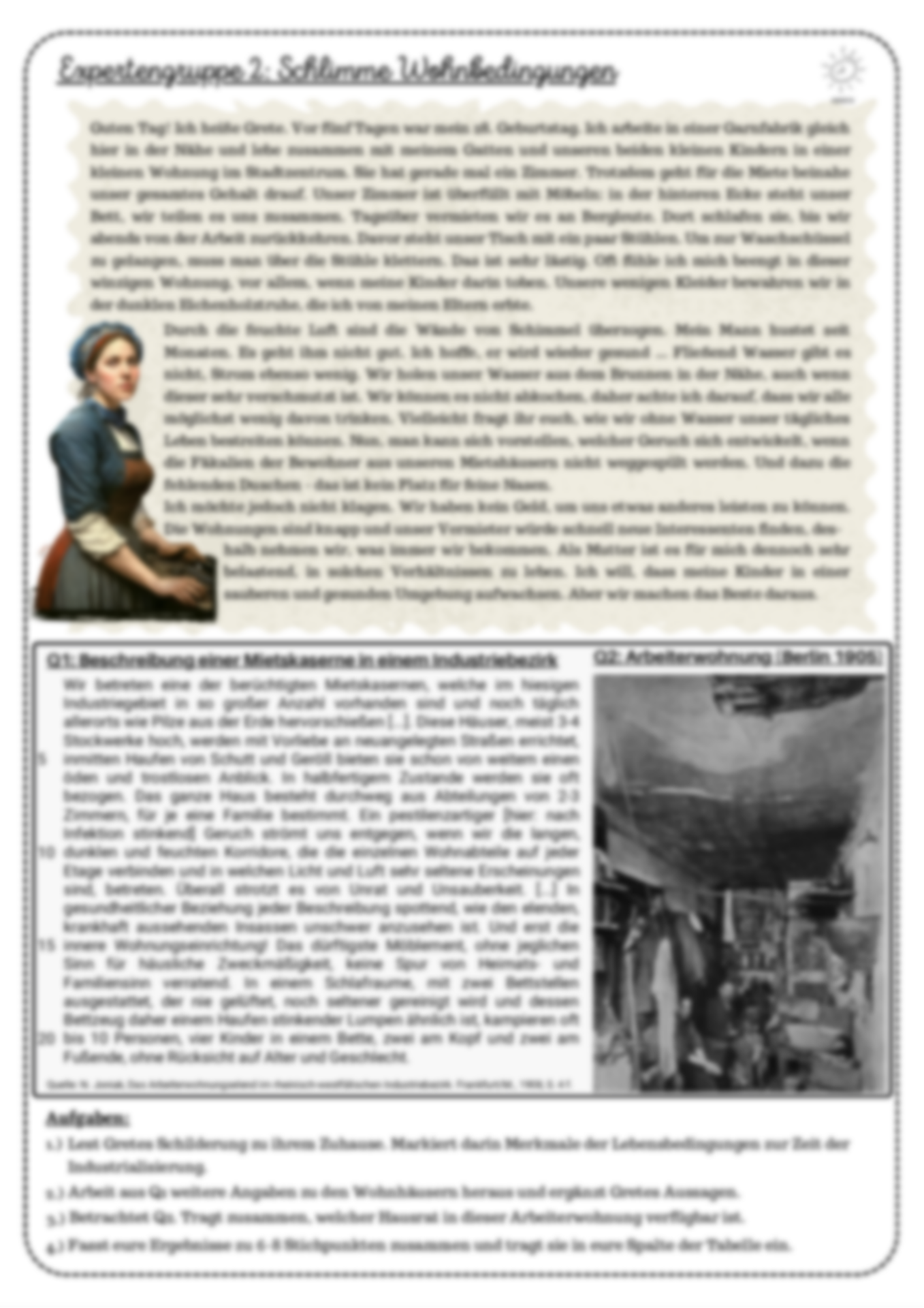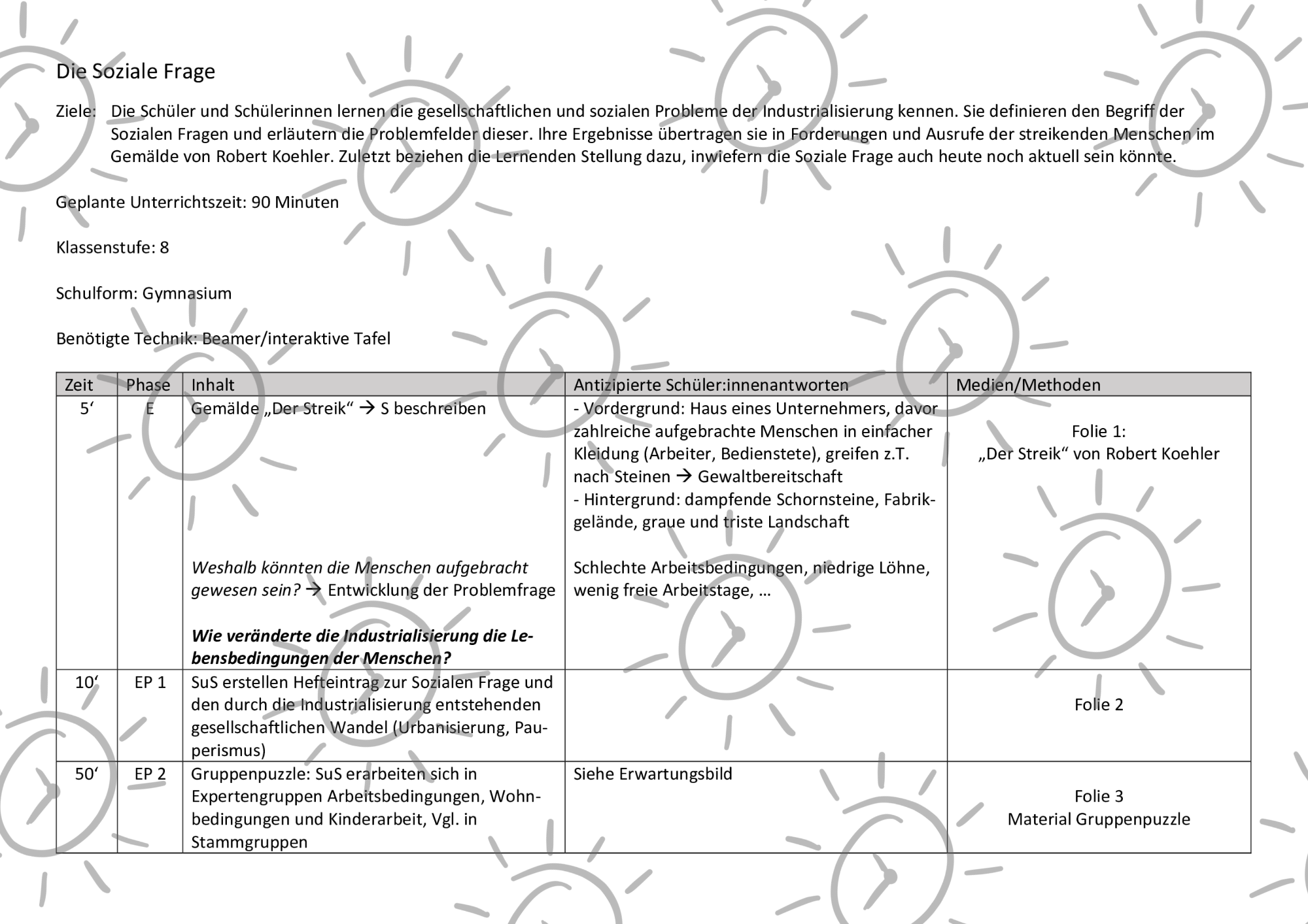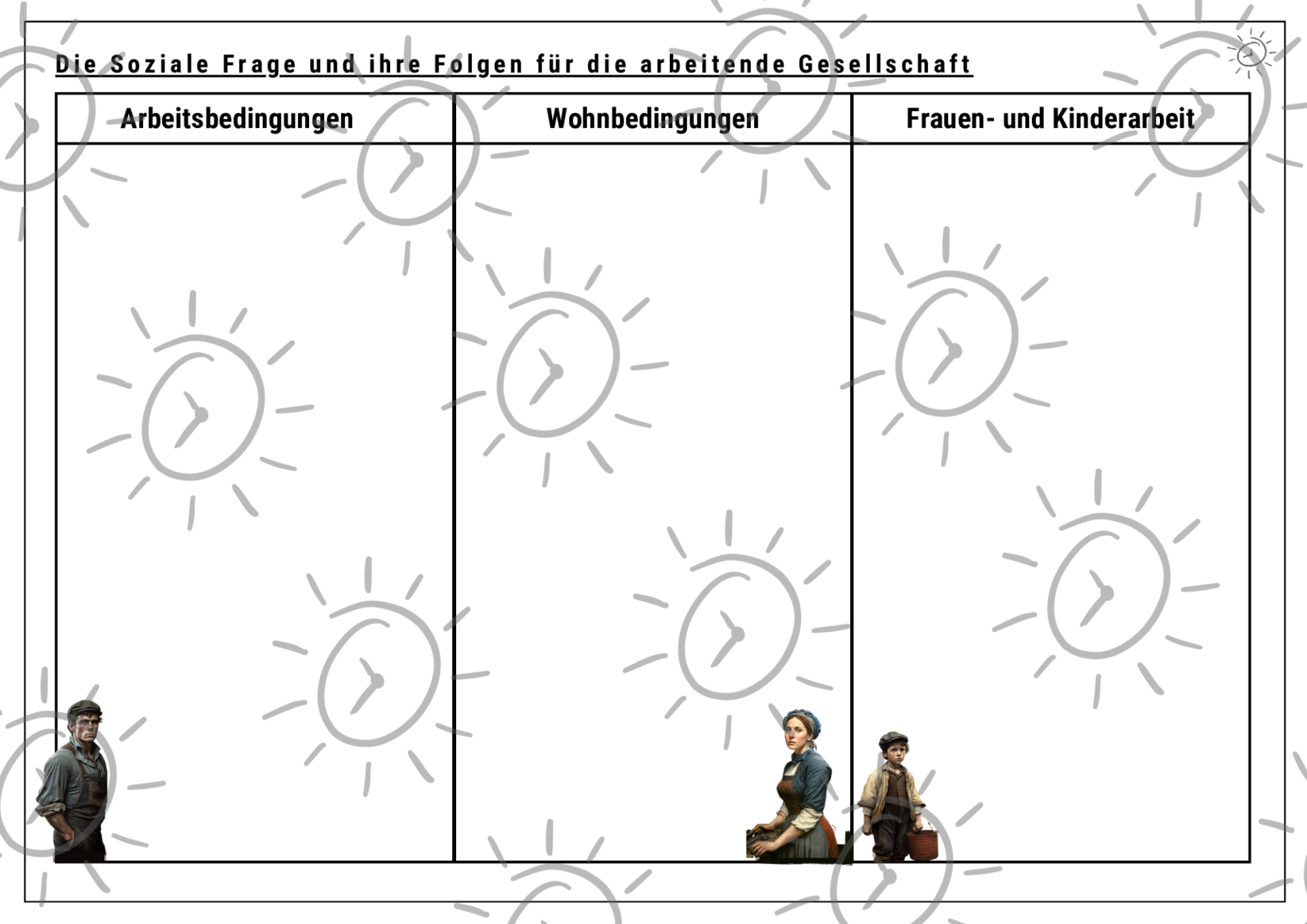 Mit diesem Unterrichtsmaterial kommen Lernende mit wichtigen Merkmalen der Sozialen Frage in Verbindung. Dieser nähern sie sich zunächst über das bekannte Gemälde „Der Streik“ von Robert Koehler an. Anschließend erarbeiten sie in Expertengruppen die Arbeitsfelder „Arbeitsbedingungen“, „Wohnbedingungen“ und „Frauen- und Kinderarbeit“. Zuletzt kehren sie zum Gemälde zurück und formulieren geeignete Forderungen der Arbeitergesellschaft in Sprechblasen. Als Transfer und Puffer wird ein Bogen zur Gegenwart gezogen und die Frage aufgeworfen, inwiefern die Soziale Frage auch heute noch eine Rolle spielt.
