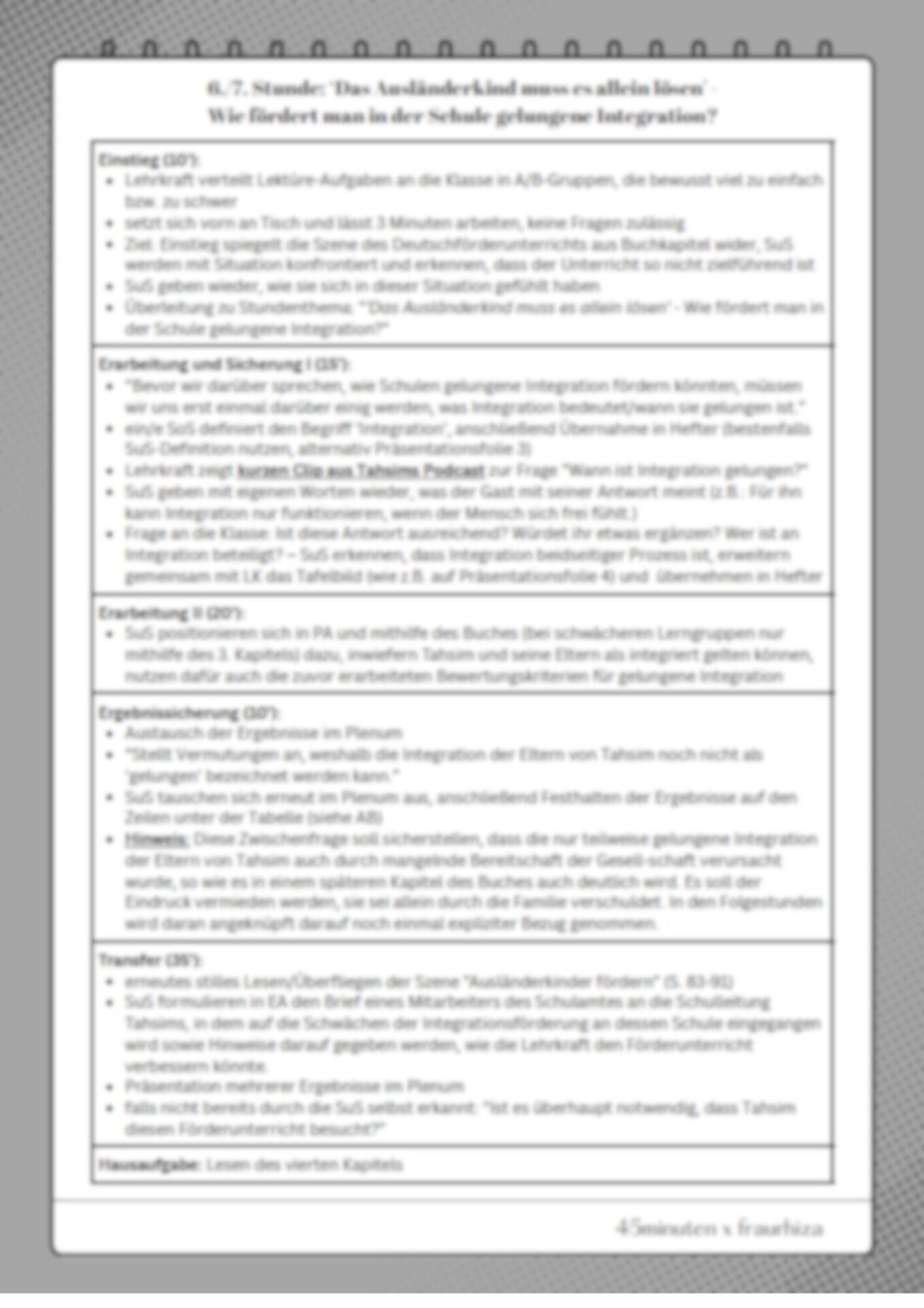 Dieses Unterrichtsmaterial eignet sich für die Lektürearbeit am Buch „Mama, bitte lern Deutsch“ von Tahsim Durgun und befasst sich mit dessen dritten Kapitel. Dabei entwickeln die SuS in Klassengemeinschaft zunächst eine gemeinsame Definition für „gelungene Integration“ und beurteilen anhand von Textstellen, ob Tahsim bzw. seine Eltern gesellschaftlich integriert sind. Anschließend analysieren sie die letzte Szene des Kapitels und werten diese anhand der Fragestellung aus, weshalb der Deutsch-Förderunterricht an Tahsims Schule als misslungen bezeichnet werden kann und welche Aspekte geholfen hätten, um ihn zielorientierter zu gestalten.