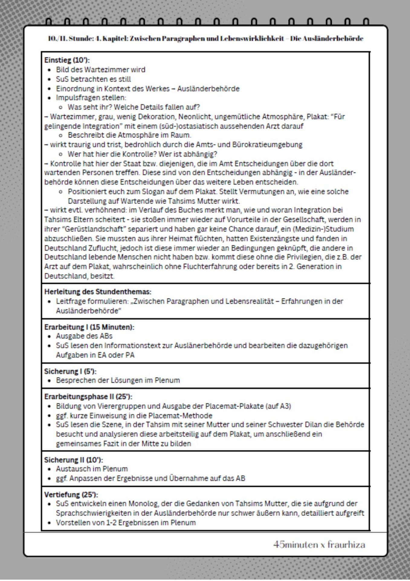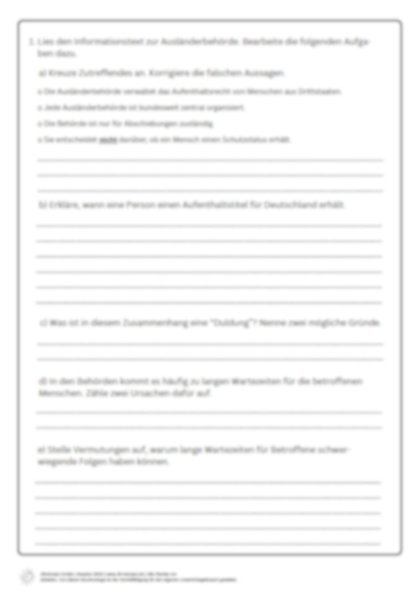 Dieses Unterrichtsmaterial befasst sich mit einer Buchszene des 4. Kapitels aus der Lektüre „Mama, bitte lern Deutsch“ von Tahsim Durgun. Darin wird der Besuch Tahsims, einer seiner Schwestern und ihrer Mutter in der Ausländerbehörde beschrieben, der mit dem gewaltsamen Übergriff eines Sicherheitsmannes auf Tahsims Mutter endet. Die Schüler:innen lernen die Aufgabe und Funktion der Ausländerbehörden kennen und analysieren anschließend mit der Placemat-Methode die Buchszene hinsichtlich unterschiedlicher Kriterien, um schließlich die Frage zu beantworten, wie in der Behörde Paragraphen und Lebenswirklichkeiten zusammenprallen.