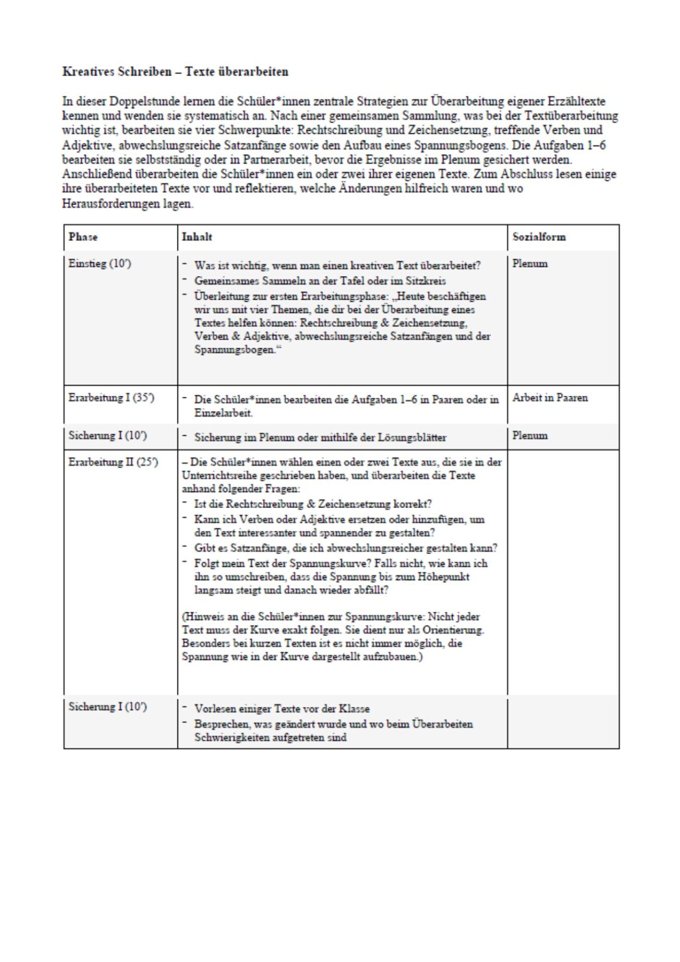 – Überleitung zur ersten Erarbeitungsphase: „Heute beschäftigen wir uns mit vier Themen, die dir bei der Überarbeitung eines Textes helfen können: Rechtschreibung & Zeichensetzung, Verben & Adjektive, abwechslungsreiche Satzanfängen und der Spannungsbogen.“