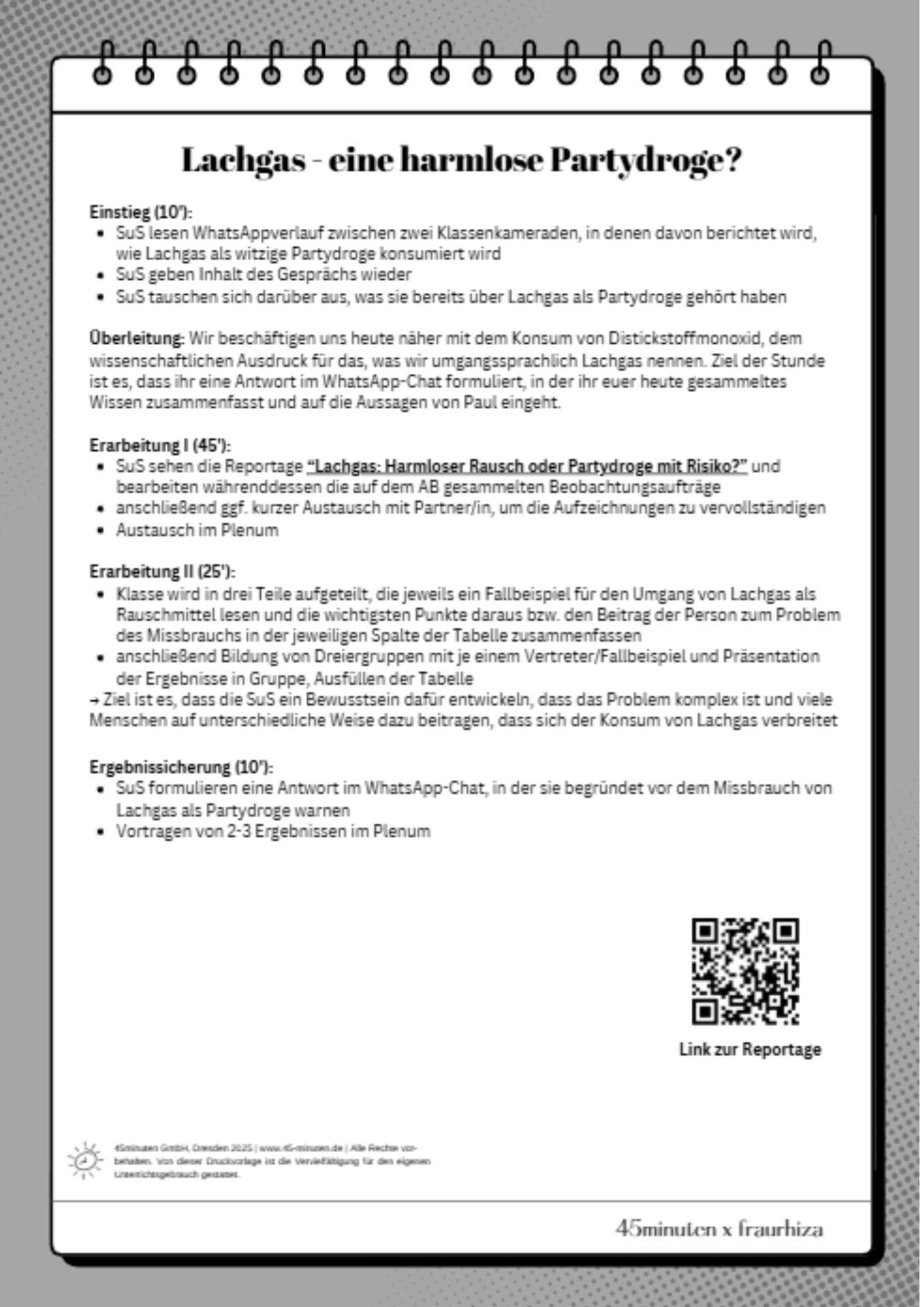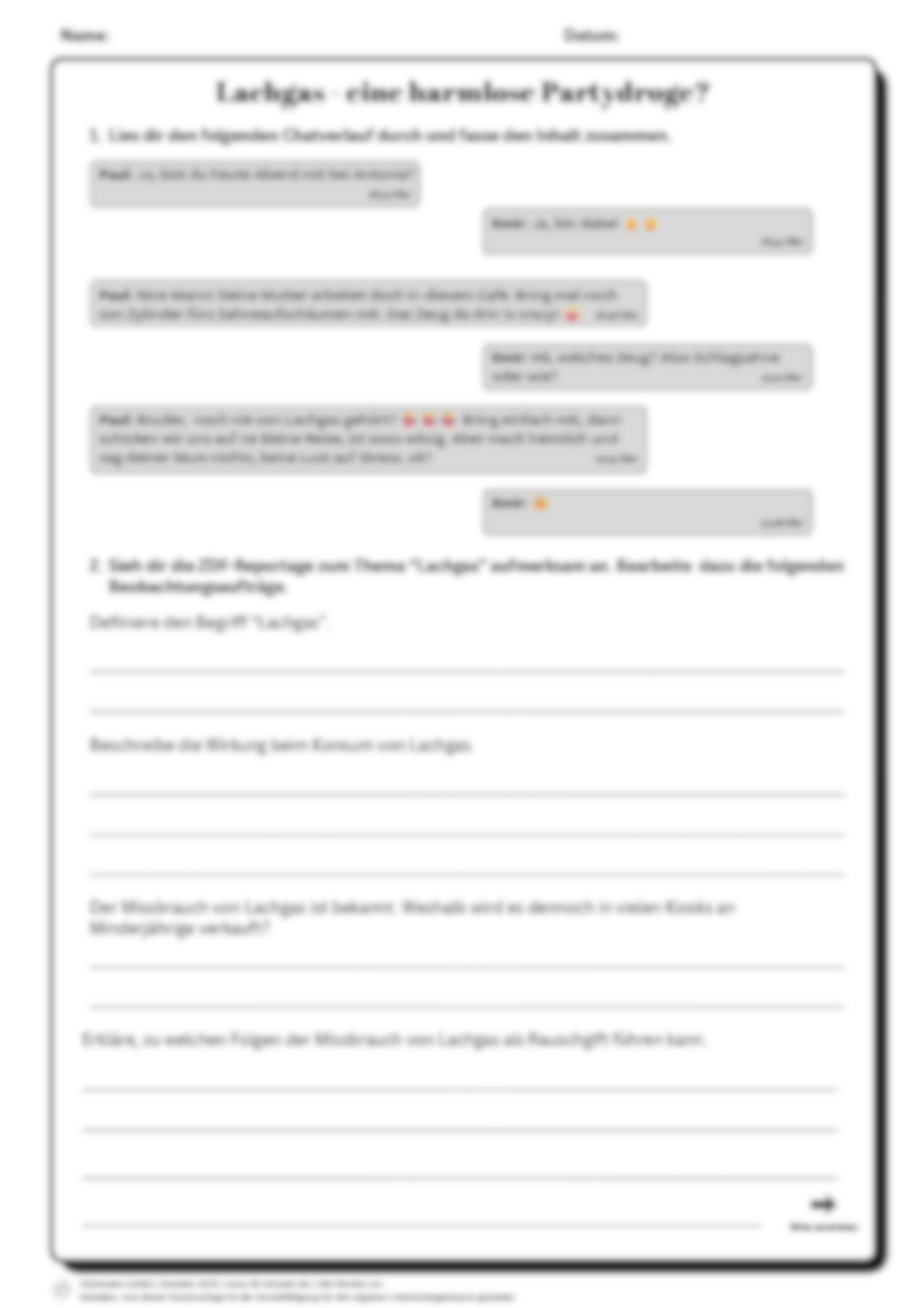 Distickstoffmonoxid„, umgangssprachlich auch Lachgas genannt, und seinen Missbrauch als Rauschmittel kennen. Sie arbeiten aus einer Reportage wichtige Informationen zur Wirkung und den Folgen des Konsums kennen und erarbeiten sich anhand unterschiedlicher Fallbeispiele Gründe dafür, weshalb der „Trend“ rund um den Lachgaskonsum immer größer wird. Anschließend beziehen sie selbst Stellung dazu, indem sie eine WhatsApp-Nachricht beantworten.