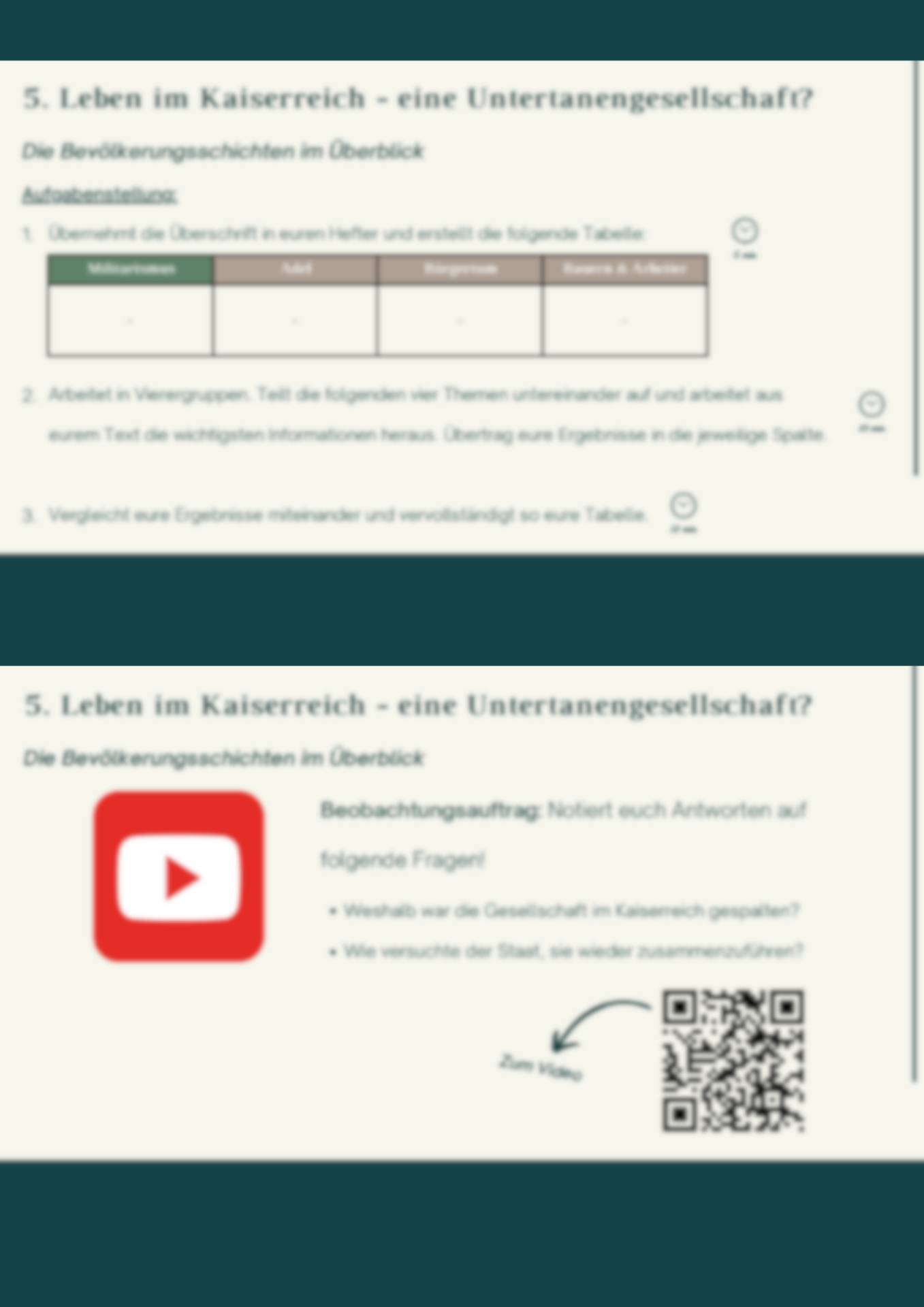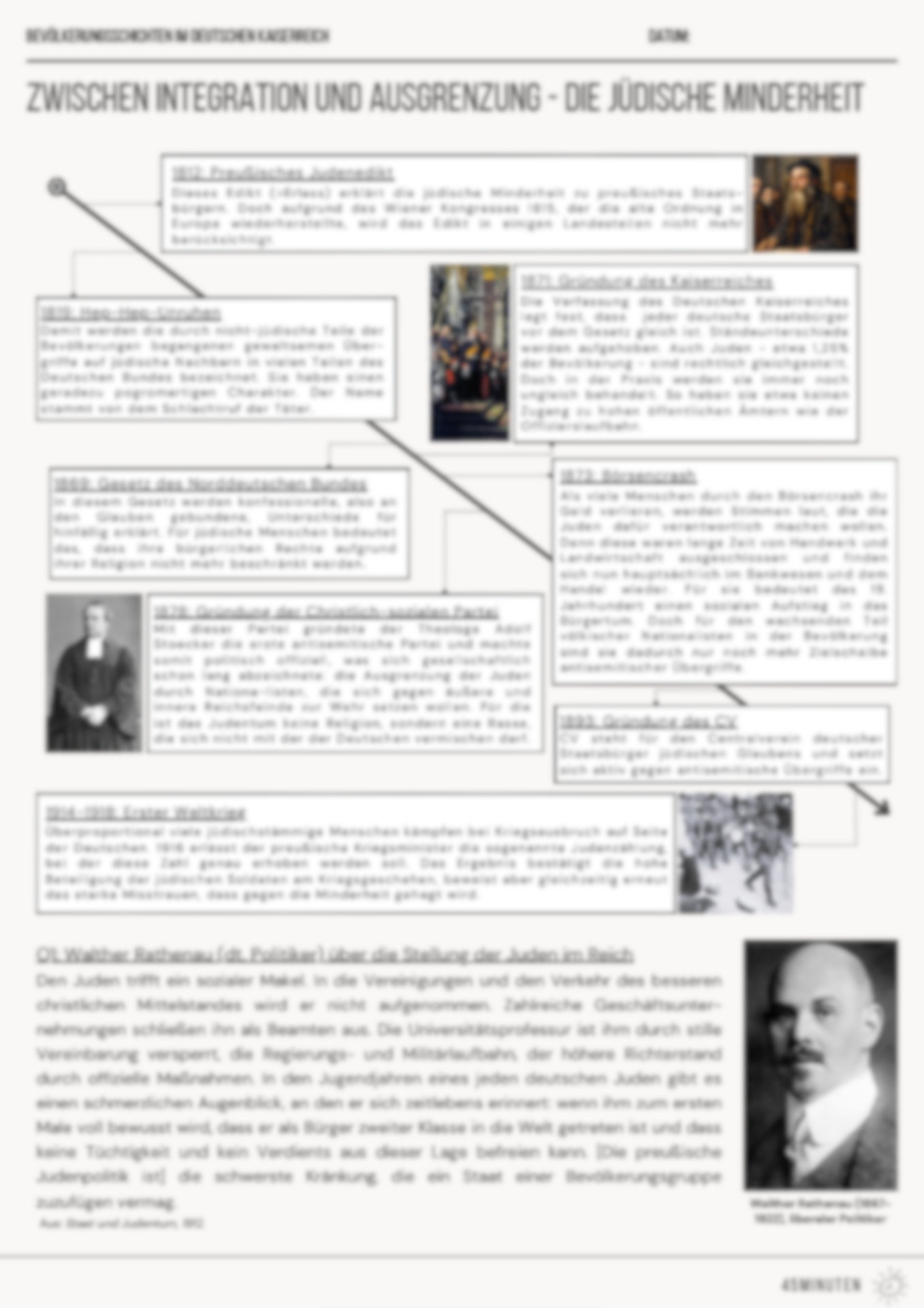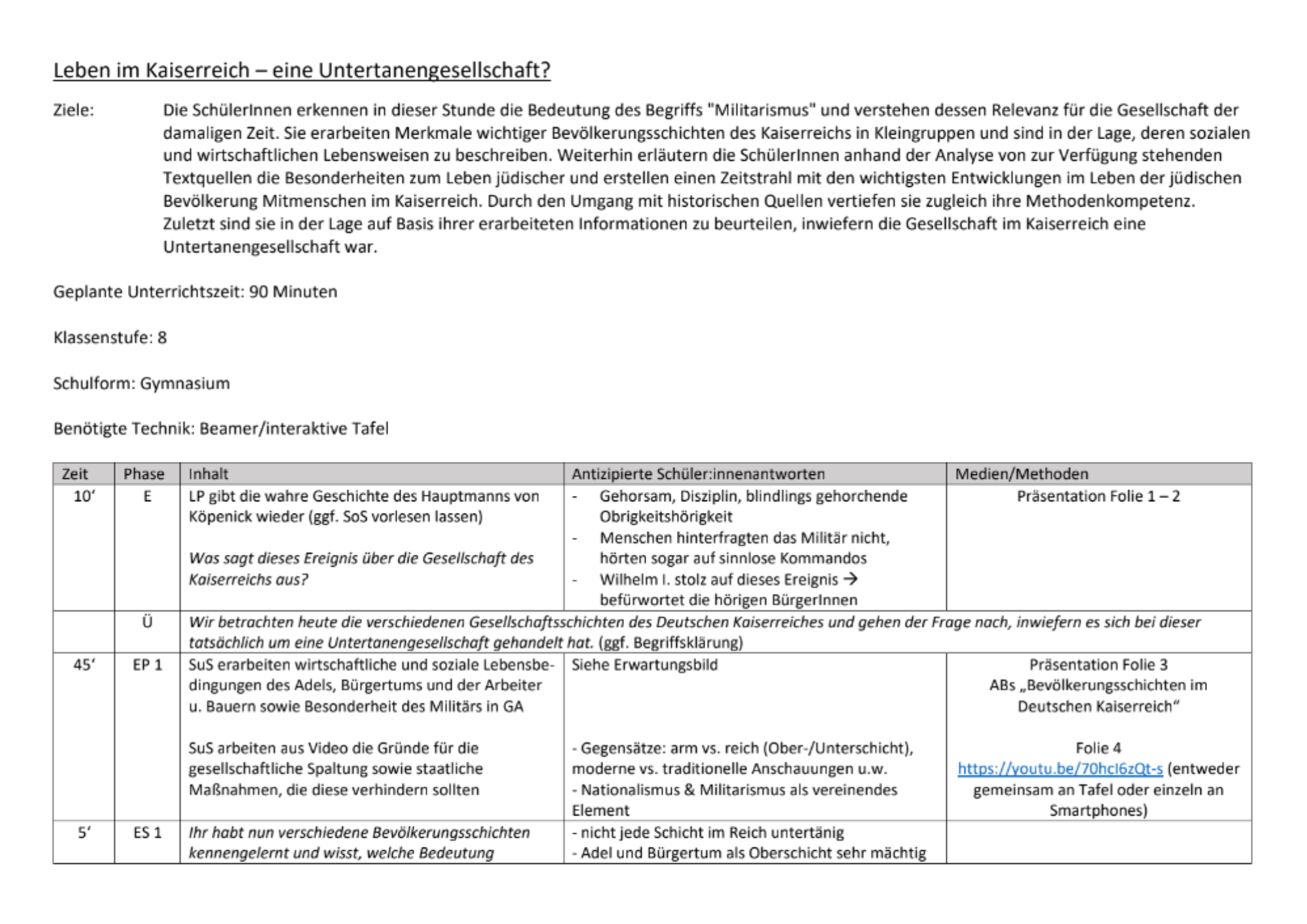 Die SchülerInnen erkennen in dieser Stunde die Bedeutung des Begriffs „Militarismus“ und verstehen dessen Relevanz für die Gesellschaft der damaligen Zeit. Sie erarbeiten Merkmale wichtiger Bevölkerungsschichten des Kaiserreichs in Kleingruppen und sind in der Lage, deren sozialen und wirtschaftlichen Lebensweisen zu beschreiben. Weiterhin erläutern die SchülerInnen anhand der Analyse von zur Verfügung stehenden Textquellen die Besonderheiten zum Leben jüdischer und erstellen einen Zeitstrahl mit den wichtigsten Entwicklungen im Leben der jüdischen Bevölkerung Mitmenschen im Kaiserreich. Durch den Umgang mit historischen Quellen vertiefen sie zugleich ihre Methodenkompetenz. Zuletzt sind sie in der Lage auf Basis ihrer erarbeiteten Informationen zu beurteilen, inwiefern die Gesellschaft im Kaiserreich eine Untertanengesellschaft war.