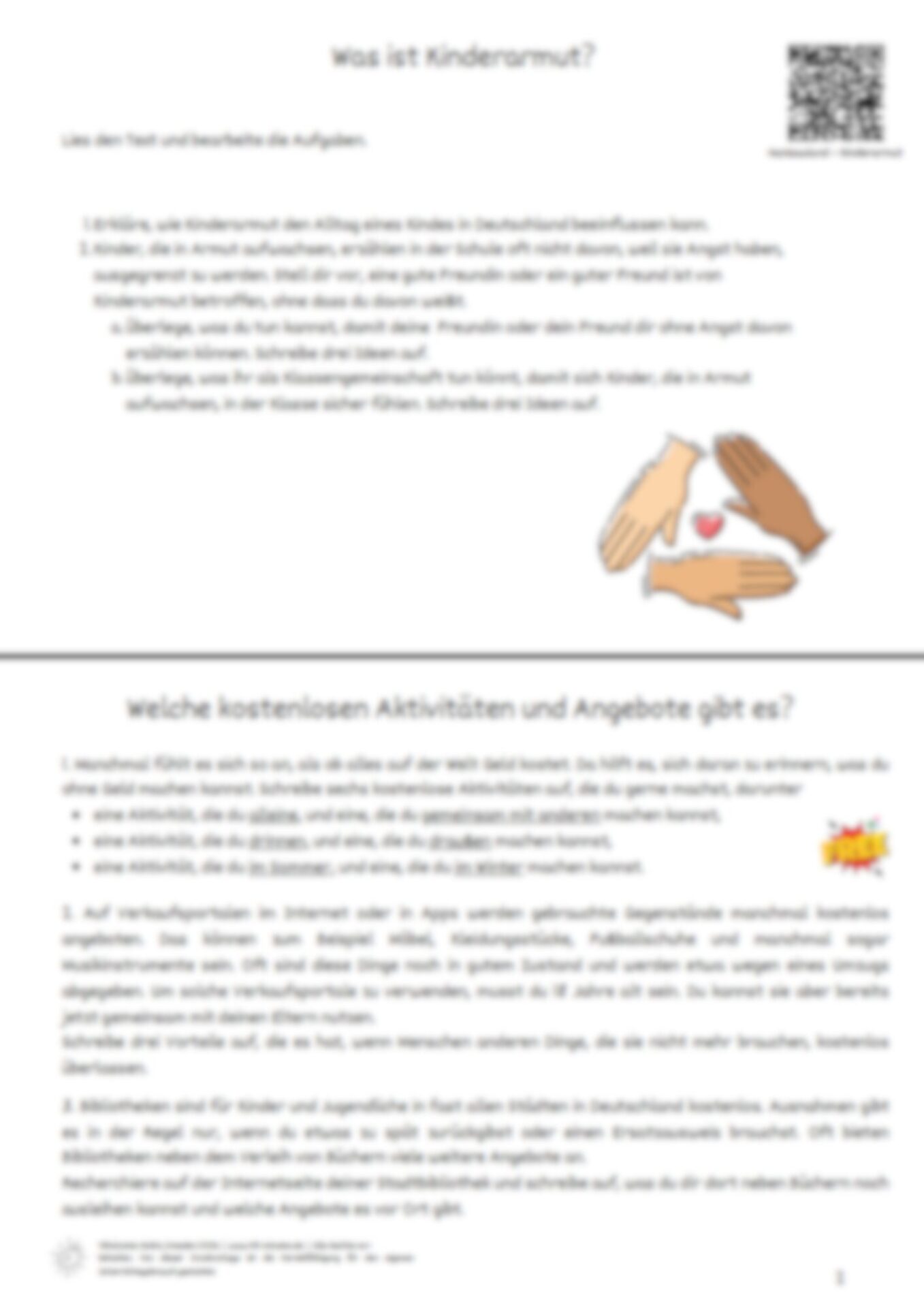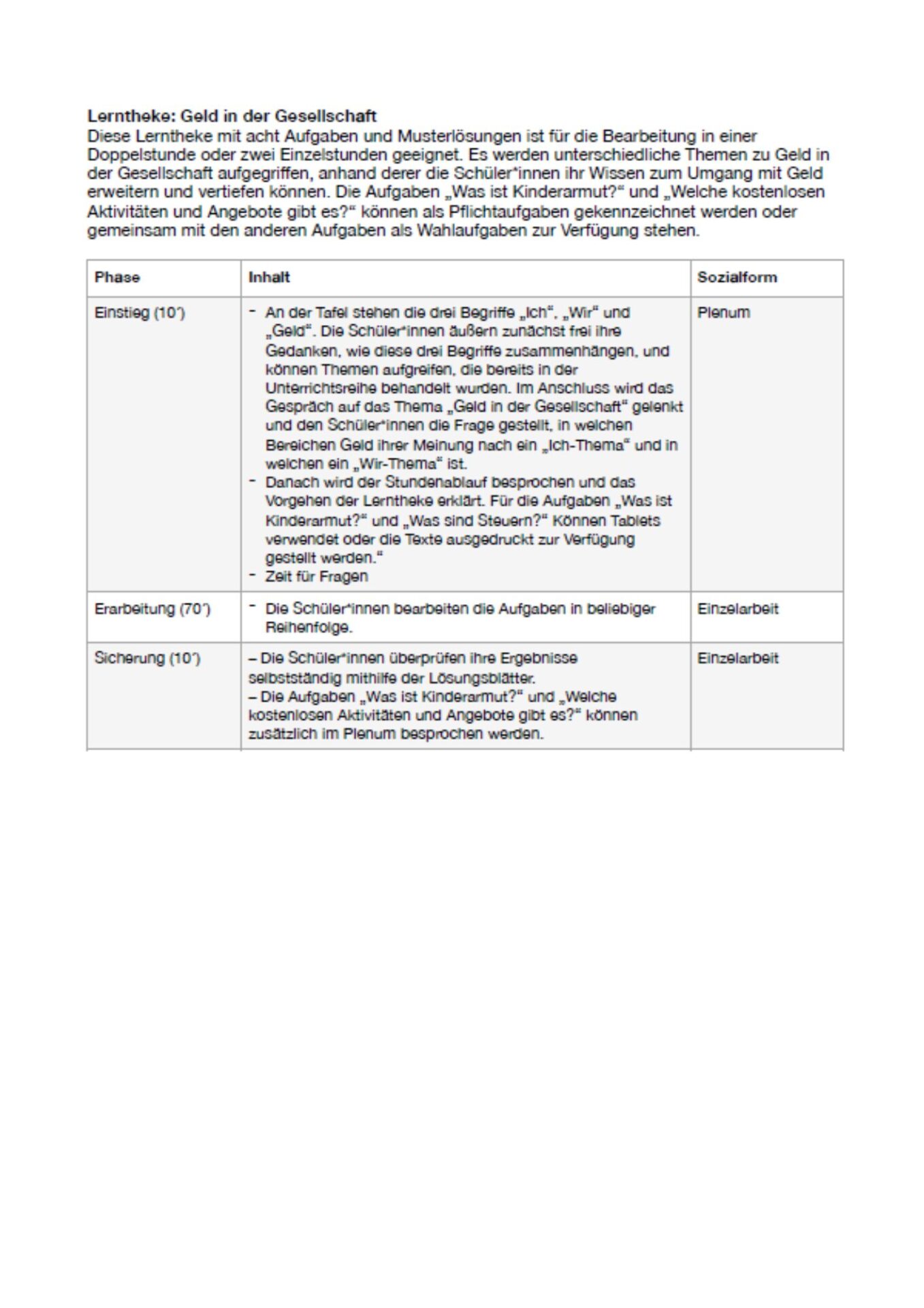 – Danach wird der Stundenablauf besprochen und das Vorgehen der Lerntheke erklärt. Für die Aufgaben „Was ist Kinderarmut?“ und „Was sind Steuern?“ Können Tablets verwendet oder die Texte ausgedruckt zur Verfügung gestellt werden.“