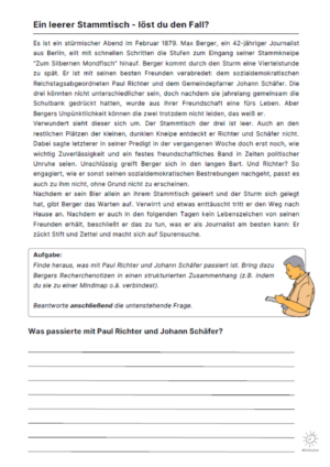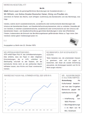 In einem Rätsel um zwei verschollene Männer, ein sozialdemokratisches Reichstagsmitglied und einen Gemeindepfarrer, begeben die SchülerInnen sich auf Spurensuche und identifizieren mithilfe der Mysterykärtchen, wen Bismarck zu Feinden des Deutsches Kaiserreiches erklärte. Aus Quellen erarbeiten sie die Maßnahmen, mit denen der Reichskanzler versuchte, gegen sie vorzugehen und rekonstruieren schließlich das Schicksal der beiden Verschwundenen.