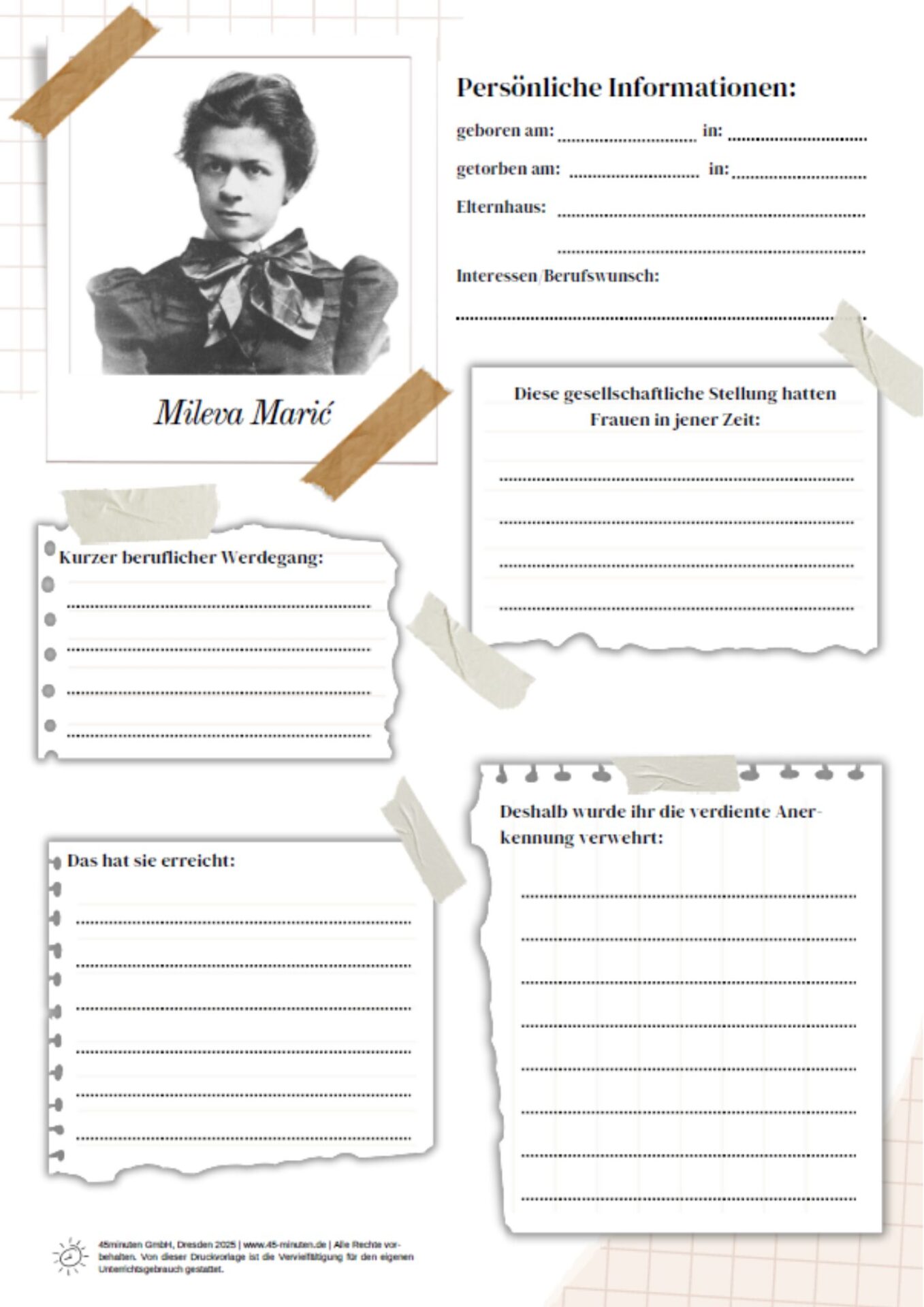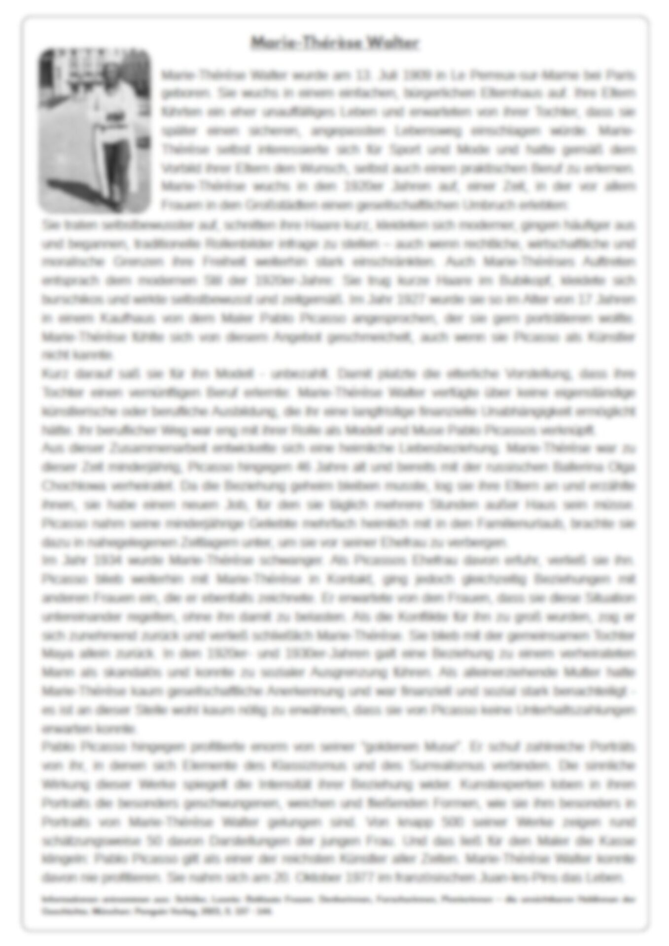 Das Unterrichtsmaterial bietet die Möglichkeit, sich in die Biographien der vier Frauen einzuarbeiten und zu erkennen, weshalb sie als Frauen ihrer Zeit nie die gleiche Chance wie ihre männlichen Kollegen gehabt haben, beruflich die verdiente Anerkennung für ihre Arbeit zu verdienen.