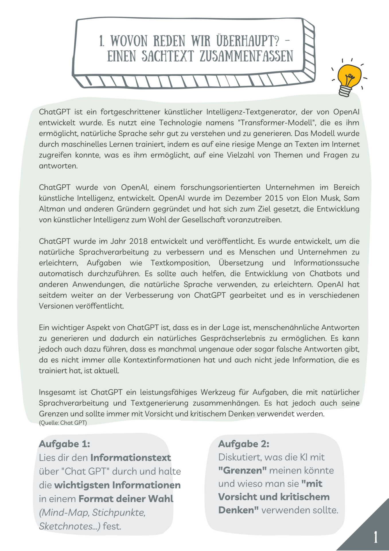In dieser Sternstunde geht es um das Thema "Argumentieren und Erörtern, „Künstliche Intelligenz“". Das Unterrichtsmaterial wurde von einer Lehrkraft, wie Dir, ursprünglich für ihren eigenen Unterricht erstellt. Nach dem Upload auf unser Portal wurde es von uns redaktionell aufbereitet und geprüft. Falls Dir dennoch ein Fehler auffällt, gib uns gern Feedback über unsere transparenten Feedbackfunktion oder unser Ticket-System.