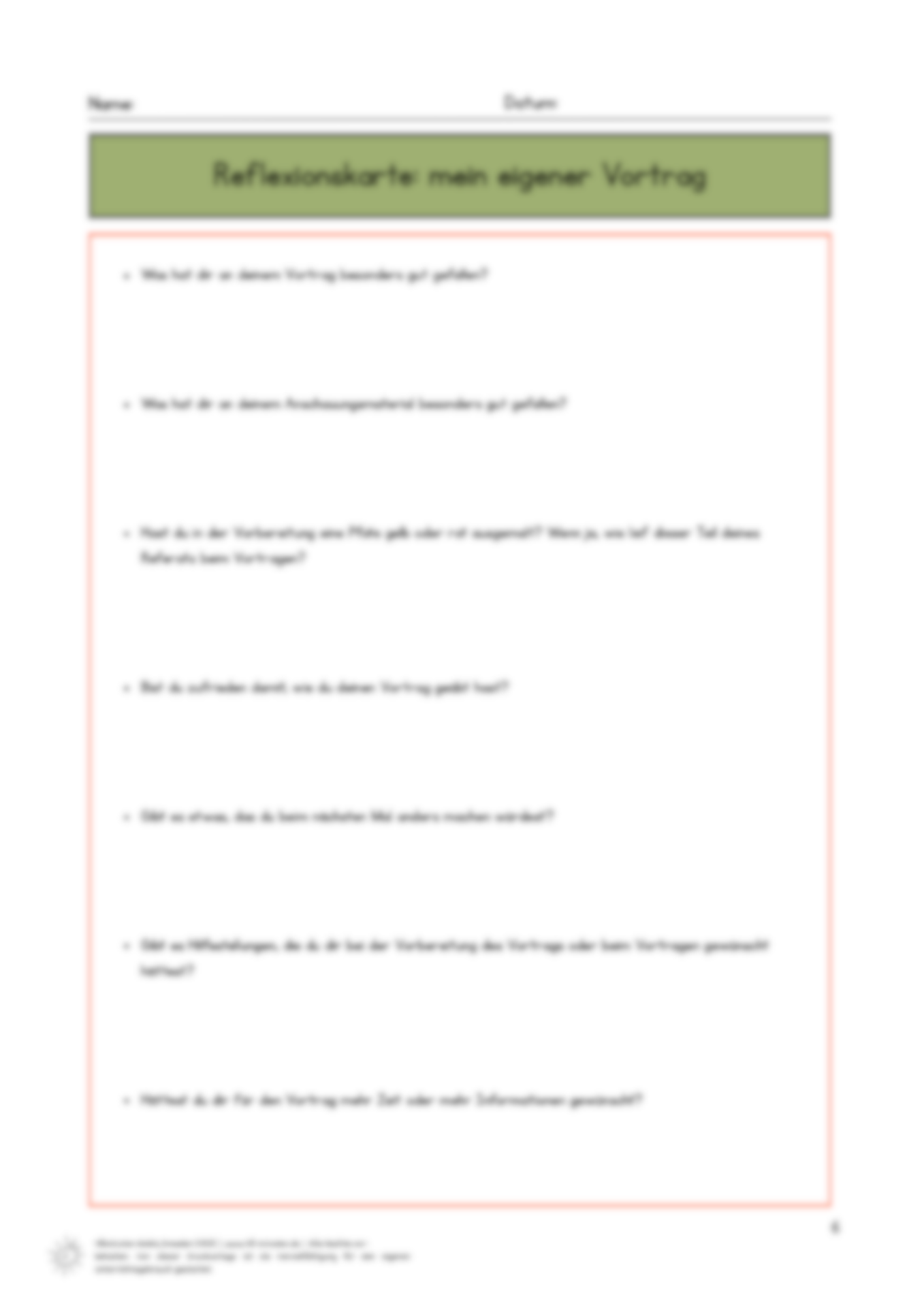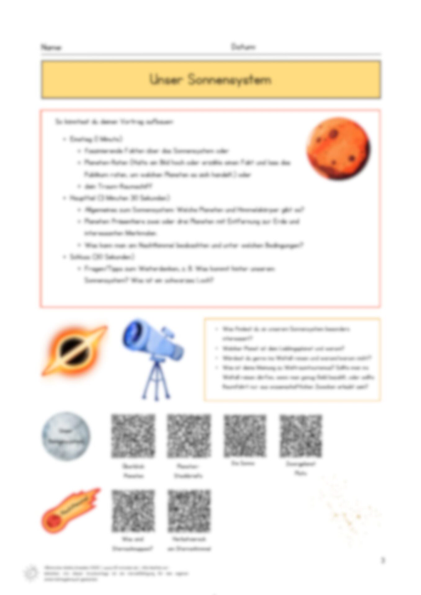 – Die Schüler*innen bereiten einen Vortrag zu einem selbstgewählten Thema oder einem der beiden vorgeschlagenen Themen („Basteln im Herbst“ oder „Unser Sonnensystem“) vor. Die Themen sind bewusst relativ einfach gehalten. Der Schwerpunkt liegt auf der Vortragstechnik und dem Anschauungsmaterial. Das sollte mit den Schüler*innen entsprechend kommuniziert sein.